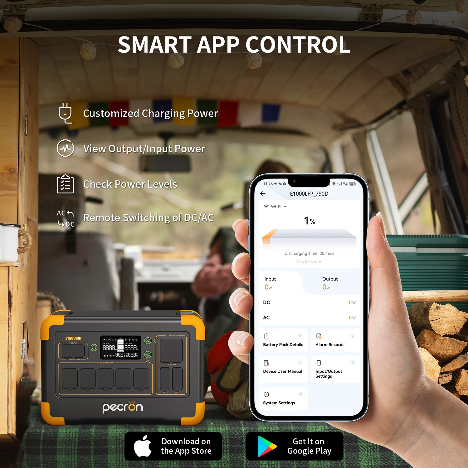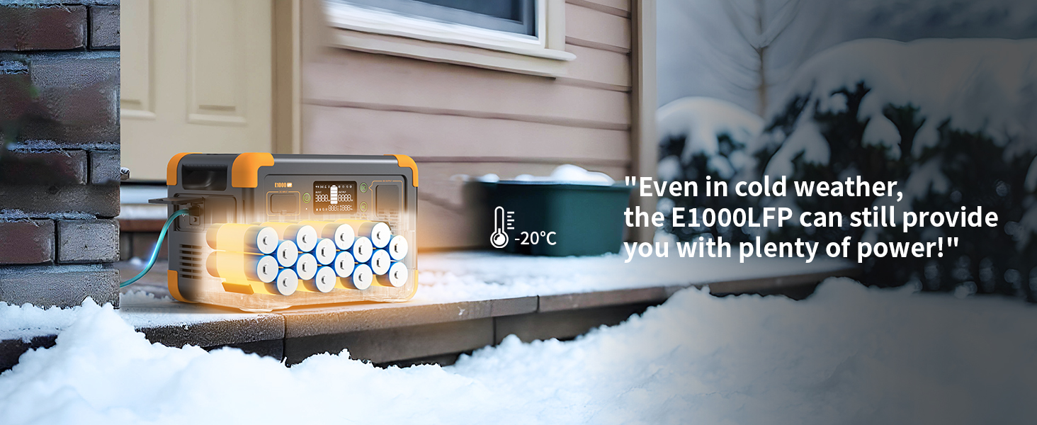 d de1800 watts y cuenta con carga súper rápida de 1000W. Puede cubrir usos regulares al aire libre y emergencias en el hogar, y su diseño compacto lo hace muy conveniente para transportar. Además, puedes controlar la estación de energía E1000LFP de forma remota mediante Wifi, incluso cuando estás fuera en el trabajo.